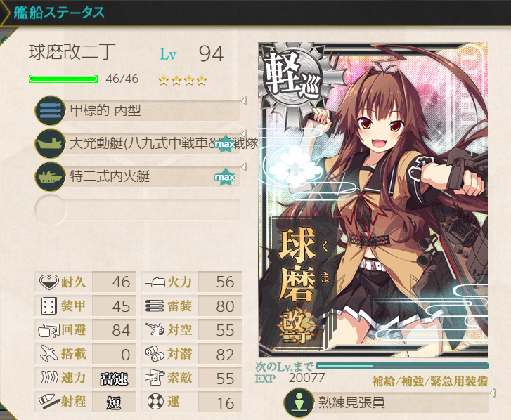 改二は普通にステも良く、大発等を装備したい場合は多摩改二や他の大発艦を使うで良さそう