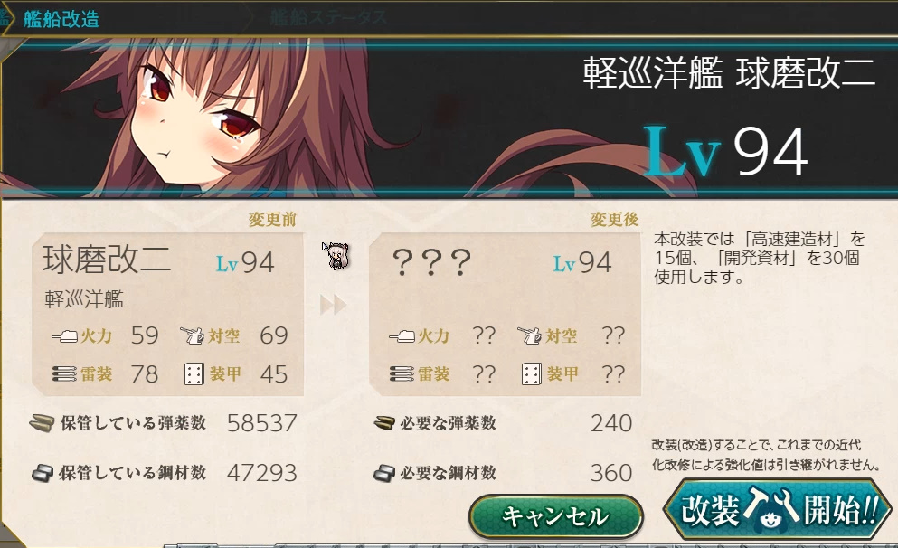 高速建造材15個、開発資材30個必要(改二丁から改二に戻す際も同様)