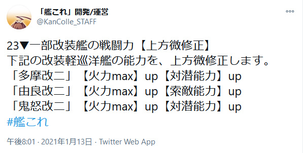 球磨改二にあわせて改二軽巡の上方修正