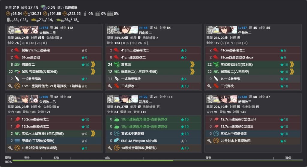 戦艦:主砲2水偵1徹甲弾1弾着観測射撃装備+5スロの伊勢型改二は艦戦で制空252以上に調整(厳しい場合はヲ級1隻編成航空優勢の126以上に制空調整)
