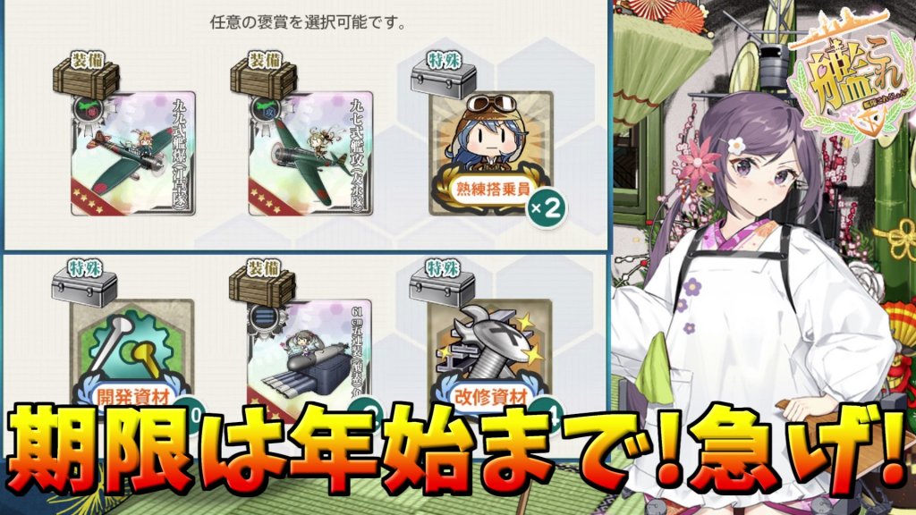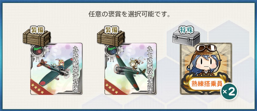 2つ目 結構どっちが良いかという質問が多いですが、正直どれを選択しても良いと思いますが、自分なら艦爆の方が入手可能な数が少ないので牧場しないなら江草隊かなと