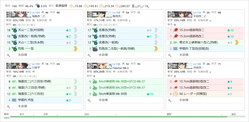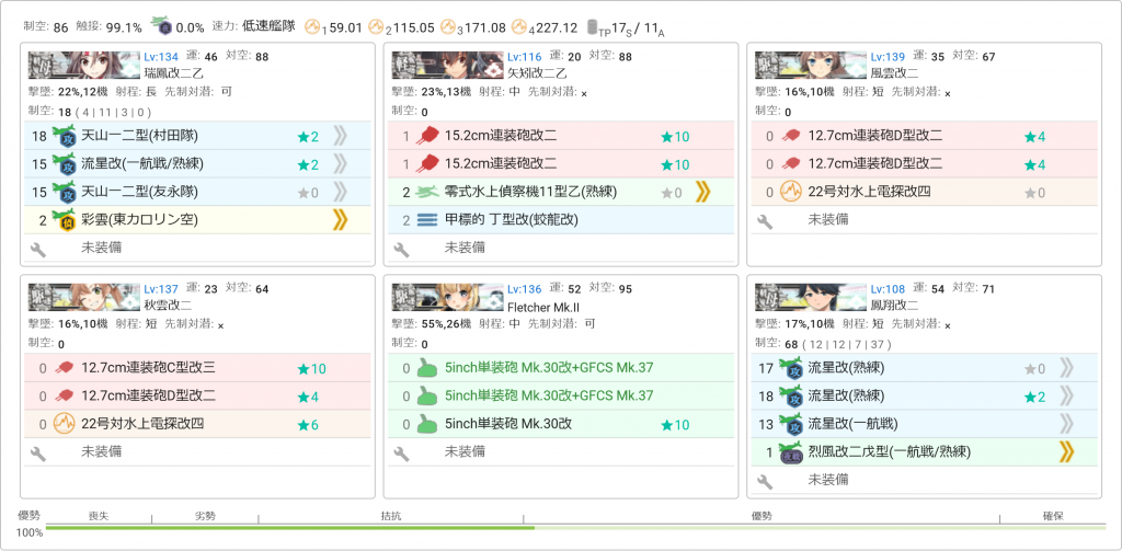 空母を旗艦、軽巡1駆逐2編成し、1-2、1-3、1-4、2-1、2-3を各1回S勝利で達成