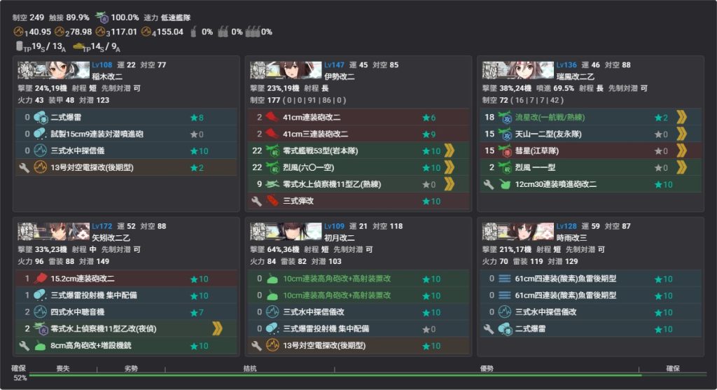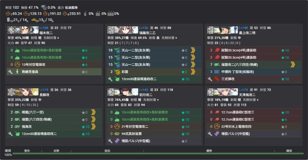 軽巡・駆逐・海防艦:先制対潜かつ対潜装備2種シナジー以上装備3以上、対空カットイン装備1