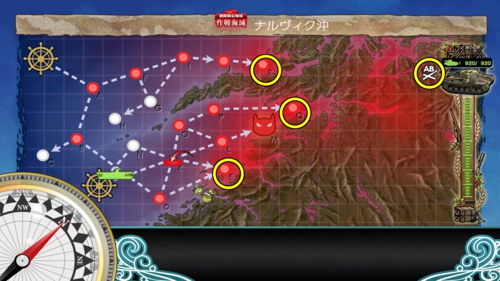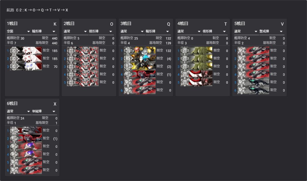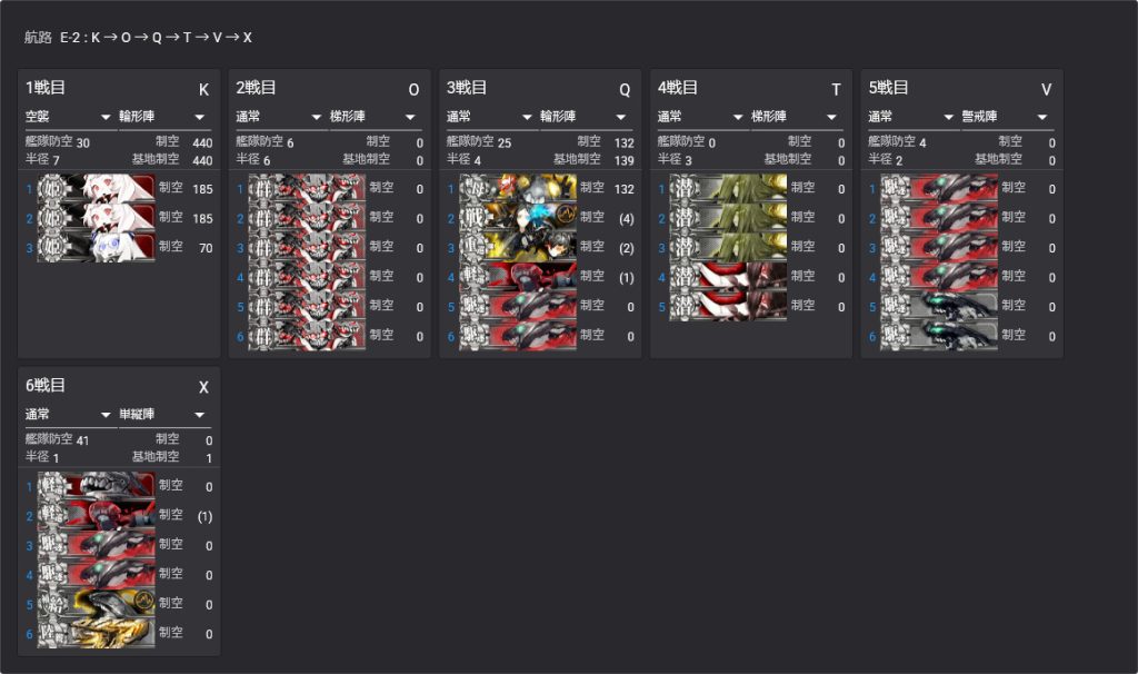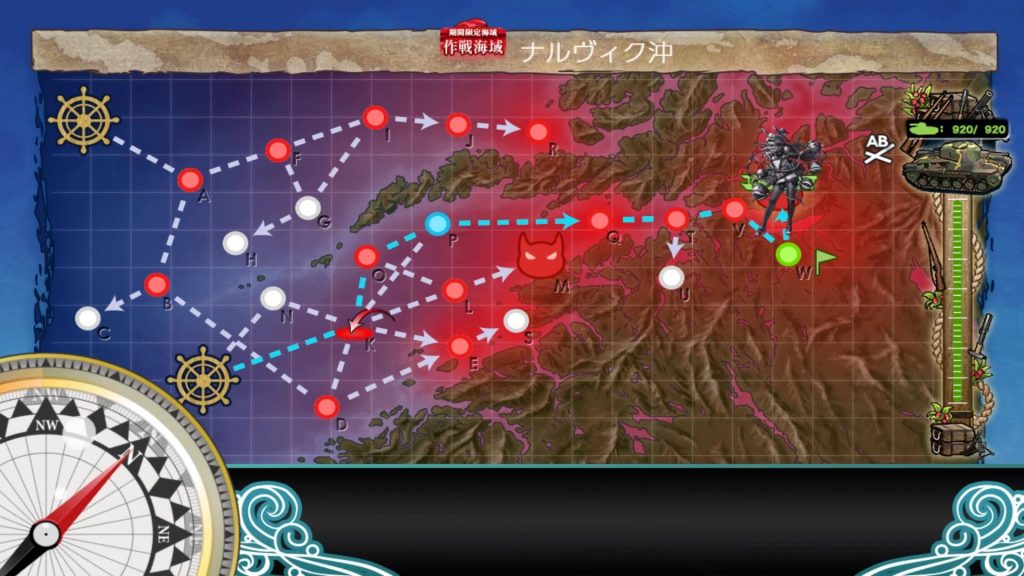 K空襲→O通常(Sボート)→P→Q通常→T潜水→索敵→V通常→W揚陸→Xボス