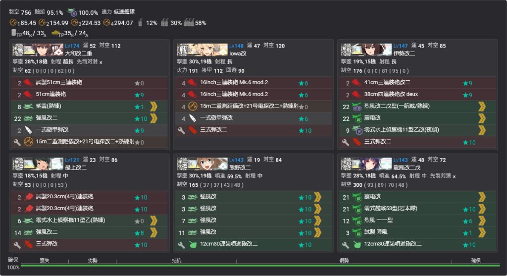 大和をここで採用がほとんどかと思いますが、大和型がいない場合は戦艦4軽空母2高速統一にすることで通ることが可能な様です