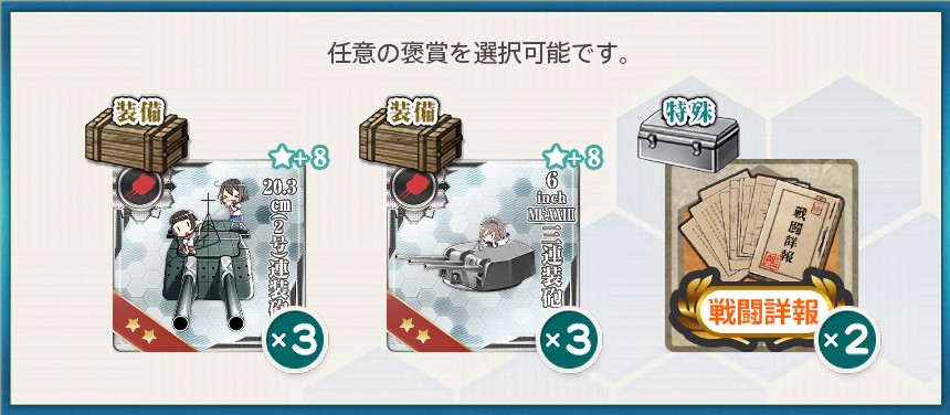 選択報酬2:20.3cm(2号)連装砲★8×3・6inch Mk.XXIII三連装砲★8×3・戦闘詳報×2