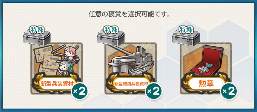 選択報酬1:新型兵装資材×2・新型砲熕兵装資材×2・勲章×2
