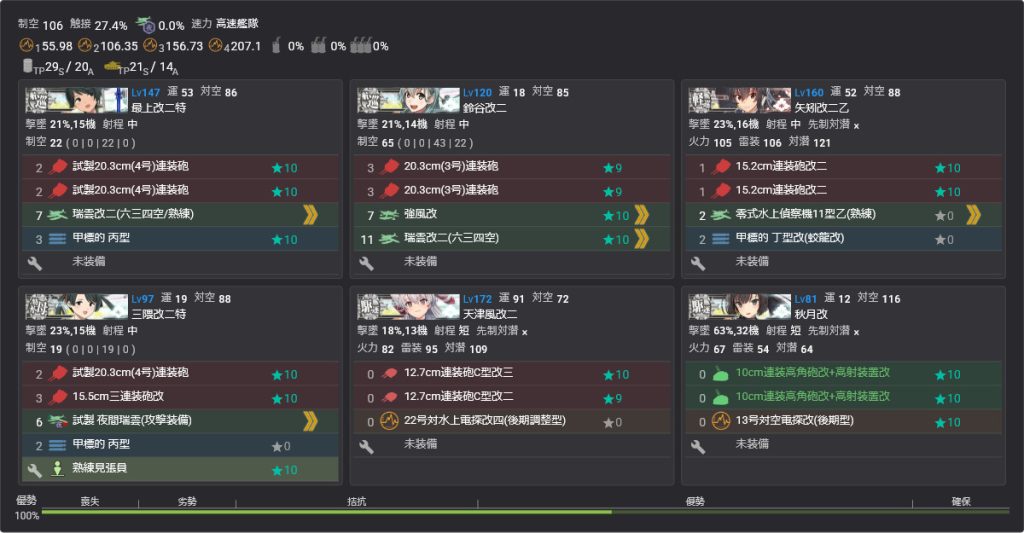 重巡・軽巡・水母:主砲2水偵(水爆)1で昼連撃+水戦で制空確保の60以上に調整