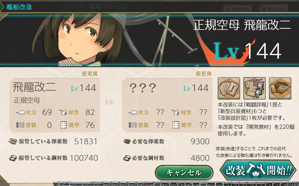 | 改装要求アイテム | 改装設計図×1 戦闘詳報×1 新型兵装資材×6 開発資材×220 |