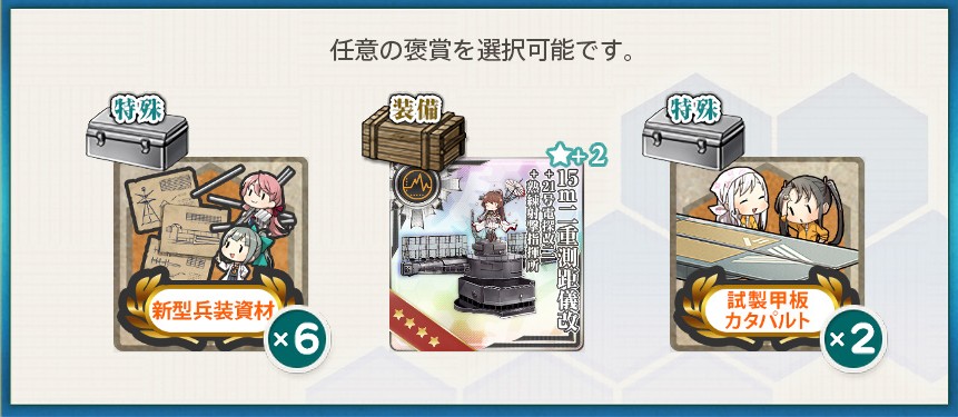 選択報酬2:新型兵装資材×6・15m二重測距儀改+21号電探改二+熟練射撃指揮所★2・試製甲板カタパルト×2