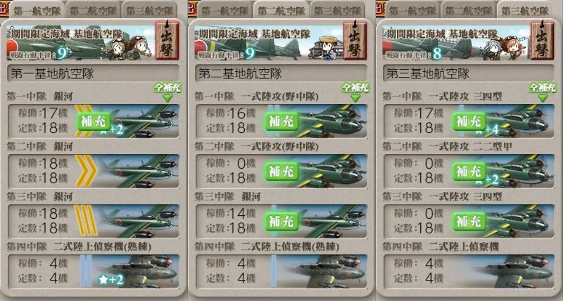 基地航空はボスが潜水艦と水上艦の混合編成なので陸攻部隊と東海部隊両方送ってSを狙うのが良い ボス戦に余裕があれば1部隊防空に回して空襲の被害減らしても良いが陸攻1部隊だと倒しきれない事もあるので確実にS狙うなら2部隊陸攻送った方が良い(ボスまでの行動半径6)
