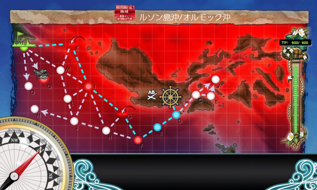 Kマスまで基地航空隊の行動半径5なので5以上で陸戦や艦戦を載せて送り、輸送連合で第一に護衛空母と航巡に艦戦と水戦ガン積みでKマスに向かうと良い