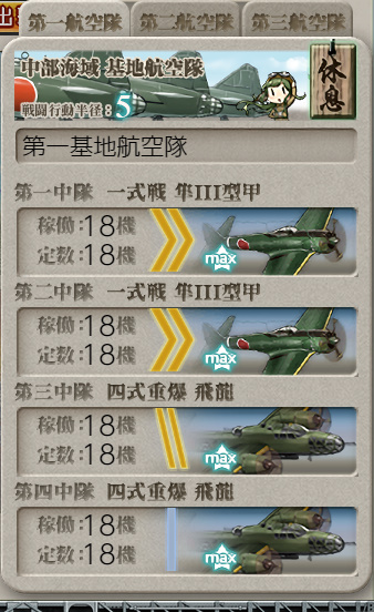 防空対空が最大19と防空専用にはなりますが、基地航空隊の防空ギミックの為に防空対空性能の高い機体は増やしておきましょう