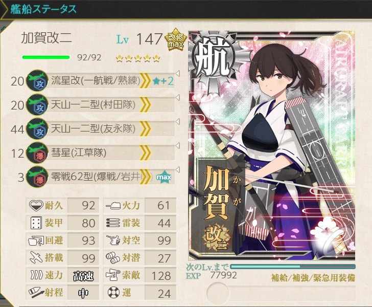 最近だと空母に艦戦のみだと攻撃できないので、制空とりつつ割合攻撃をさせる場面もあったので、制空の高い水戦を用意していきたい