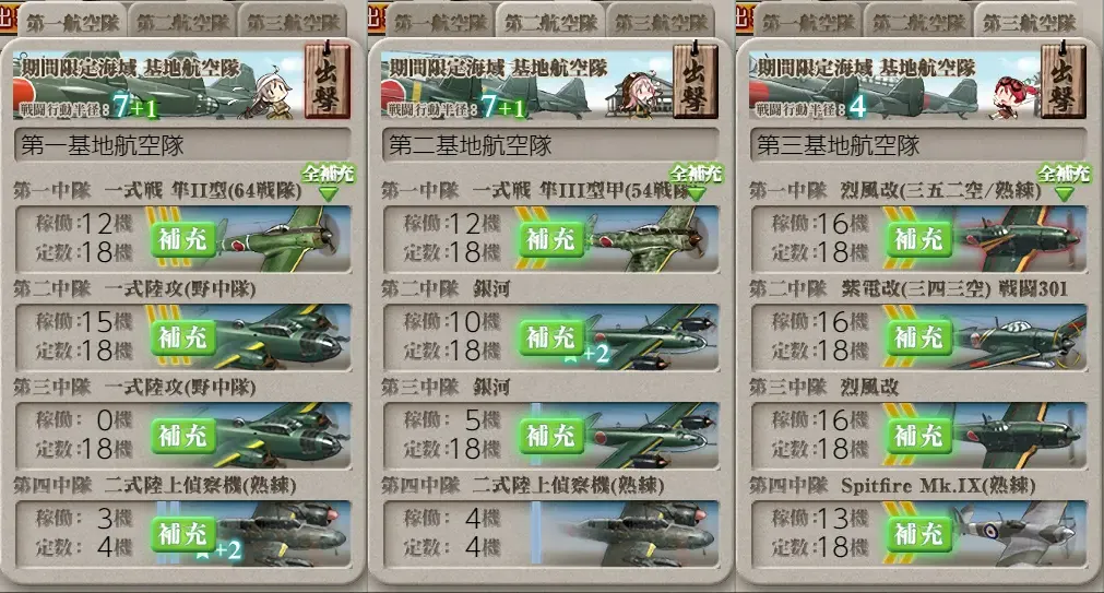 2戦目の空襲マスが非常に事故が多いので基地1部隊を空襲マスに送り敵の艦載機を削り、潜水マスは対潜支援を使って抜ける方法をやってみた所安定して道中抜ける事が出来たので対潜支援の手間を気にしないならこの方法もオススメ 行動半径3なのである程度強力な陸戦も使えます