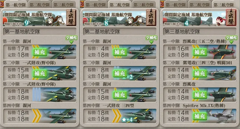 2戦目の空襲マスが非常に事故が多いので基地1部隊を空襲マスに送り敵の艦載機を削り、潜水マスは対潜支援を使って抜ける方法をやってみた所安定して道中抜ける事が出来たので対潜支援の手間を気にしないならこの方法もオススメ 行動半径3なのである程度強力な陸戦も使えます