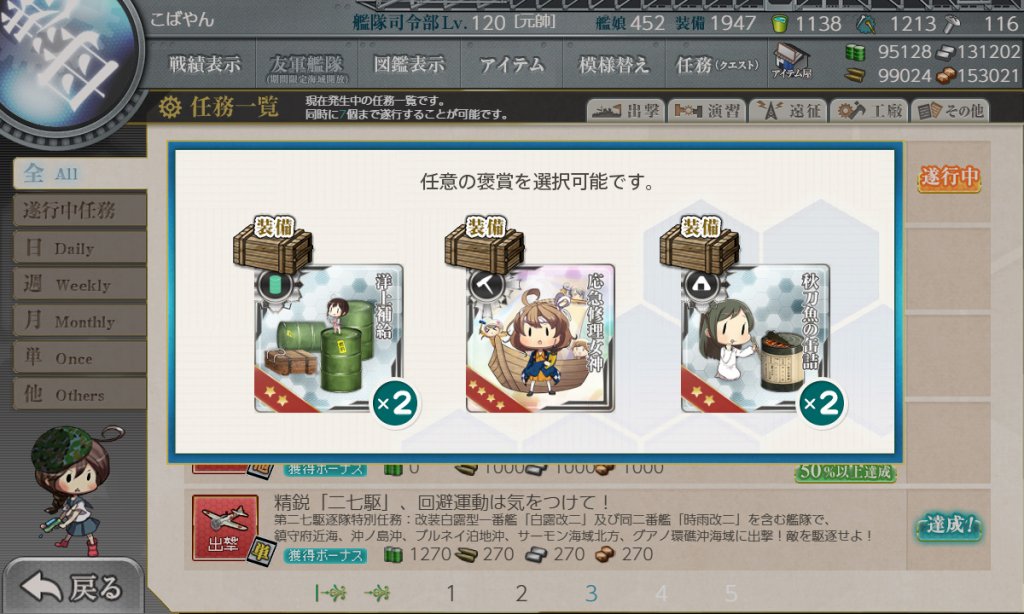 駆逐:主砲2夜戦連撃装備、余裕あれば対潜装備
