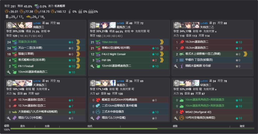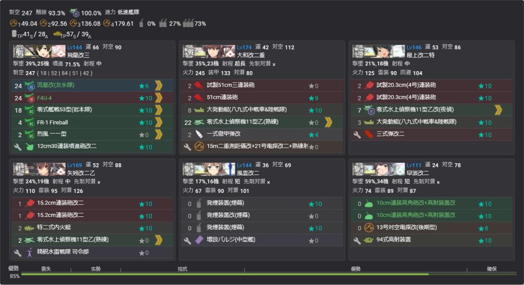 航空優勢を取るため、補給艦の枠は山汐丸またはしまね丸を想定してますが、耐久がもろいため、制空拮抗にして南極観測船宗谷を編成しても良いと思います。