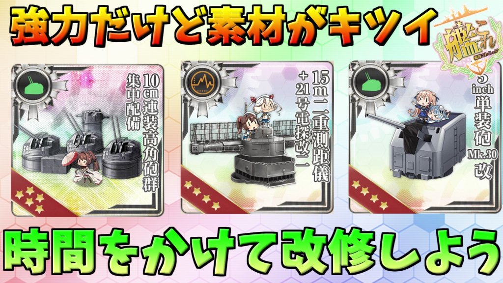 ★6以降の改修素材に94式高射装置が要求されるので改修MAXは大変ですが、★6までの素材は10cm連装高角砲3本なので、本数は多いですが開発可能な素材なので★6まで改修しておくのをオススメ